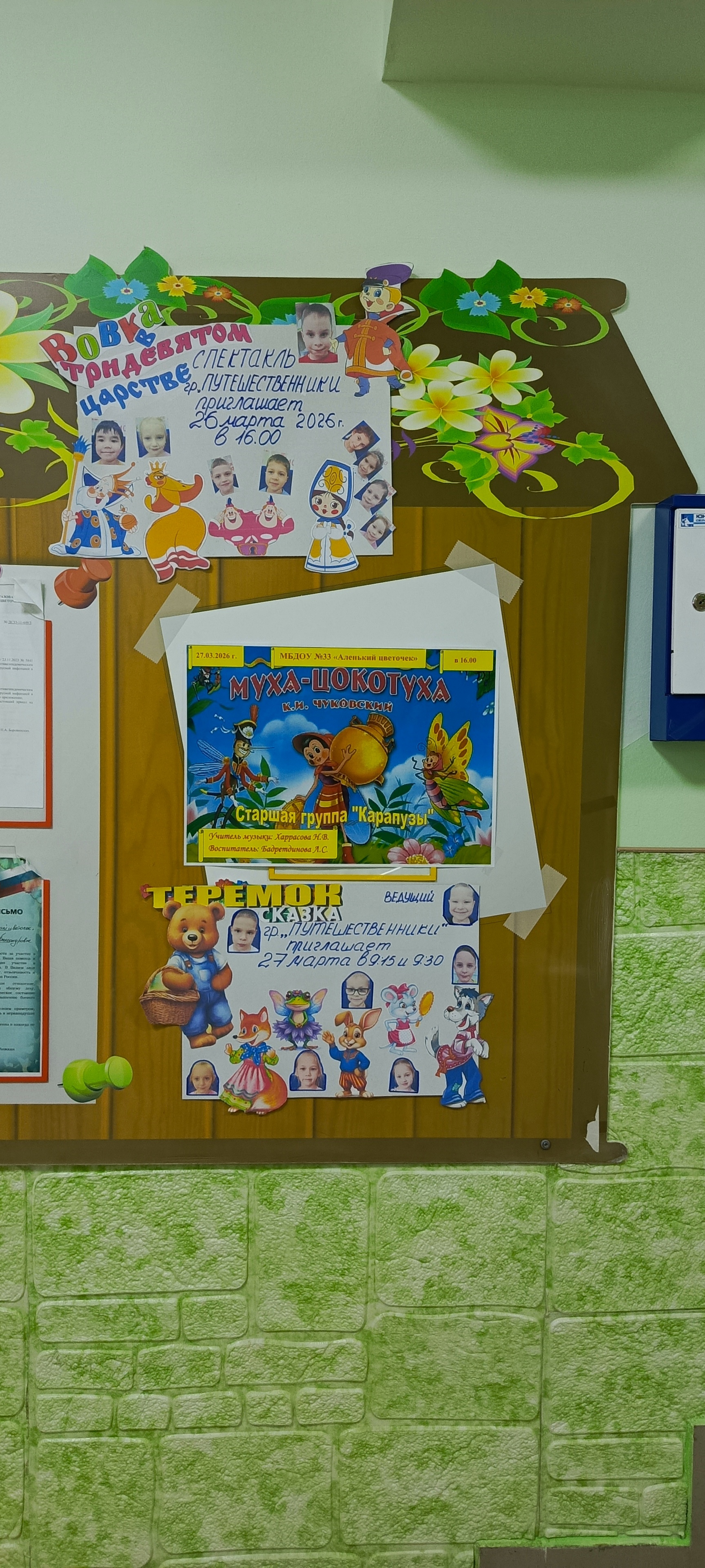 Несколько спектаклей «Вовка в тридевятом царстве», «Теремок» (актёры дети подготовительной группы «Путешественники», воспитатели О.С. Чекмышева, И.П. Думич) прошли в интерактивном взаимодействии со зрителями https://vk.ru/wall-130216447_77