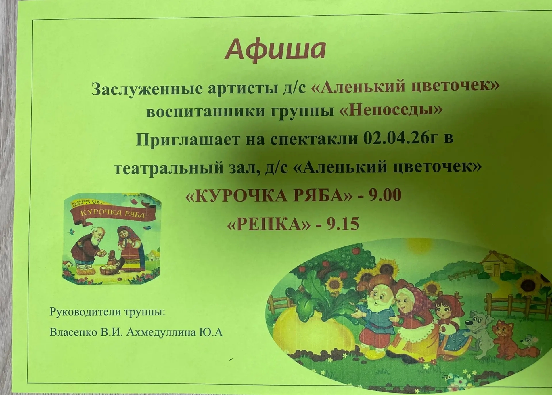 В спектакле «Курочка ряба» https://vk.com/ds33_surgut?z=video-212598621_456240262%2F93f8307f9249c8fd6f вместе с малышами группы «Непоседы» (дети от 2до 3 лет, воспитатели В.И. Власенко, Ю.А. Ахмедуллина) выступали родители.
